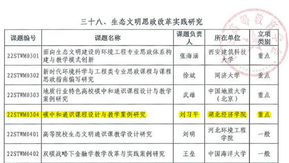 近日,中国高等教育学会公布“2022年度高等教育科学研究规划课题”立项名单,新葡萄官网刘习平副教授主持的1项生态文明思政改革实践研究课题《碳中和通识课程设计与教学案例研究》获批为重点项目。中国高等教育学会“2022年度高等教育科学研究规划课题”面向全国高校申报,其中生态文明思政改革实践研究课题重点项目共4项。