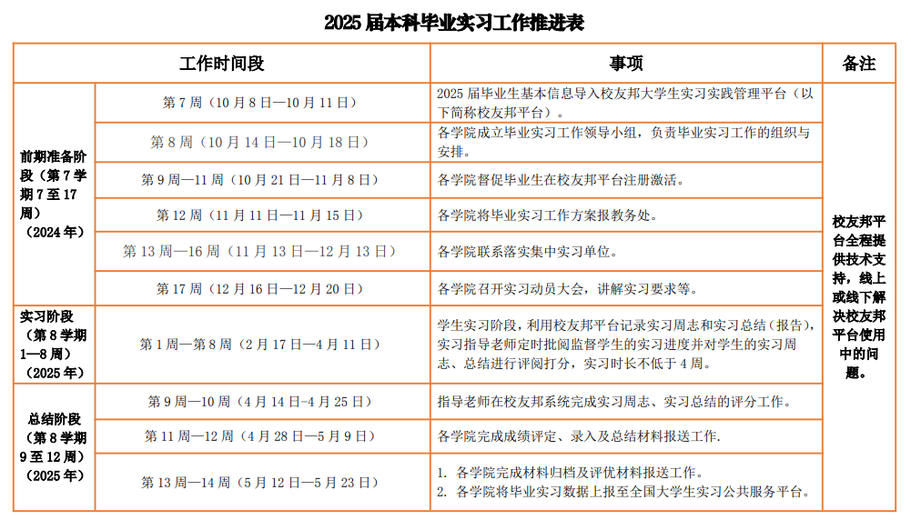 1.第7学期第7-12周:毕业生基本信息导入校友邦平台,组织师生进行平台操作培训并试用。进行实习动员,讲解实习要求;