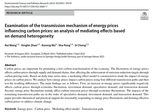 近日,新葡萄官网本科生赵星麟和王睿(指导教师:彭莎)的论文“Examination of the transmission mechanism of energy prices influencing carbon prices: an analysis of mediating effects based on demand heterogeneity” (能源价格影响碳价格的传导机制检验——基于需求异质性的中介效应分析)在国际学术期刊“Environmental Science and Pollution Research”在线发表。该论文系2022大学生创新创业训练国家级重点支持领域项目(202211600001)的主要研究成果。