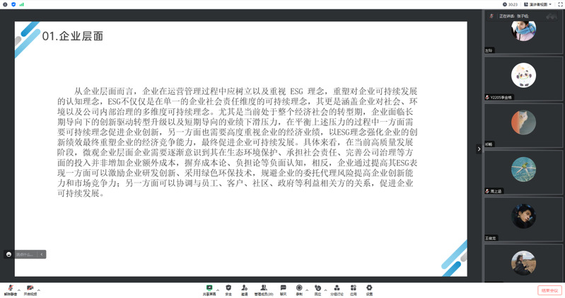 会议开始,由荀瑶、张子钰就“ESG对企业绩效的影响”为主题展开分享,从环境、社会、公司治理等方面讲解ESG对企业绩效的影响,增强同学们对ESG的了解。接下来由刘源、赵妍妍、杨钰丹和董洁以“开发性金融促进‘一带一路’能源转型的关键路径和政策优化研究”为主题进行分享,研究基于数据分析、理论推演和案例分析的方式,揭示开发性能源融资影响绿色能源转型的现状和内在机制。