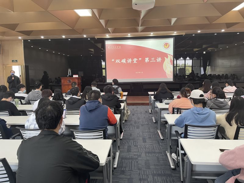 2021年11月18日下午,由新葡萄8883官网AMG主办的“双碳讲堂·第3期”在教5第一报告厅举行。中国进出口银行湖北省分行经理虞毅带来“绿色金融概述及相关应用”的主题报告,讲座由学院院长助理黄锦鹏主持,130余位师生参会。