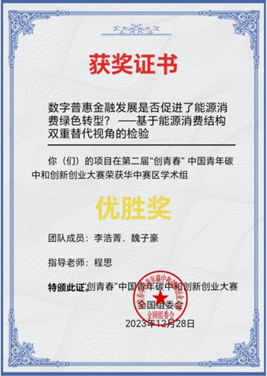 2023年12月17日,第二届“创青春”中国青年碳中和创新创业大赛华中区域赛落下帷幕,新葡萄官网低碳经济与管理专业大二学子李浩菁研究论文荣获华中赛区学术组优胜奖,指导老师为程思老师。